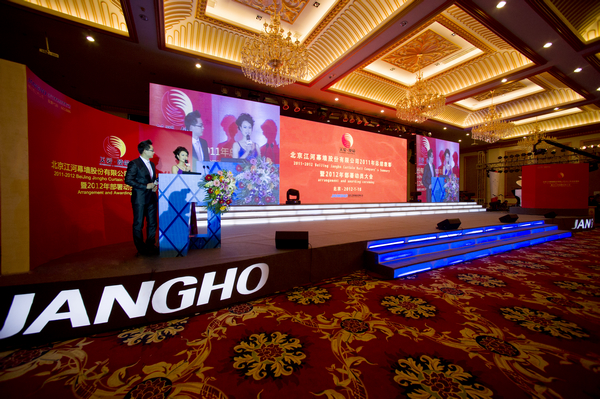 2012年1月18日,江河幕墻2011年總結表彰暨2012年部署動員大會隆重召開,劉載望董事長攜公司全體高層領導及奮戰在全球各地的中外籍員工參加。會議通過中英文雙語主持,中文及英語(同聲傳譯)兩個頻道直播傳輸,采用中國北京、廣東、上海、重慶四地視頻會議互動及與新加坡、香港、澳門、越南、澳大利亞、馬來西亞、印度、加拿大、智利、美國、迪拜、阿布扎比、巴林、卡塔爾、沙特、科威特等各地在線視頻收看相結合的方式同步進行,讓全球江河人共同融入到這一全員的年終盛宴中;全員在感受公司2011年輝煌的同時共同吹響了江河幕墻2012年“關愛·使命”的戰斗號角,為江河幕墻2012年新的騰飛夯實牢固根基。